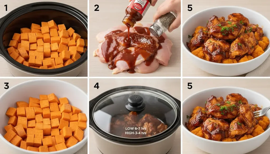Cook on low for 6–7 hours until the chicken is fully cooked and the sweet potatoes are soft.